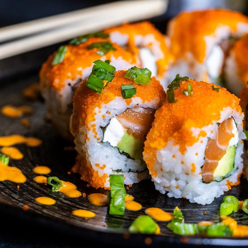 Fresh salmon and creamy avocado, topped with roe and scallions.