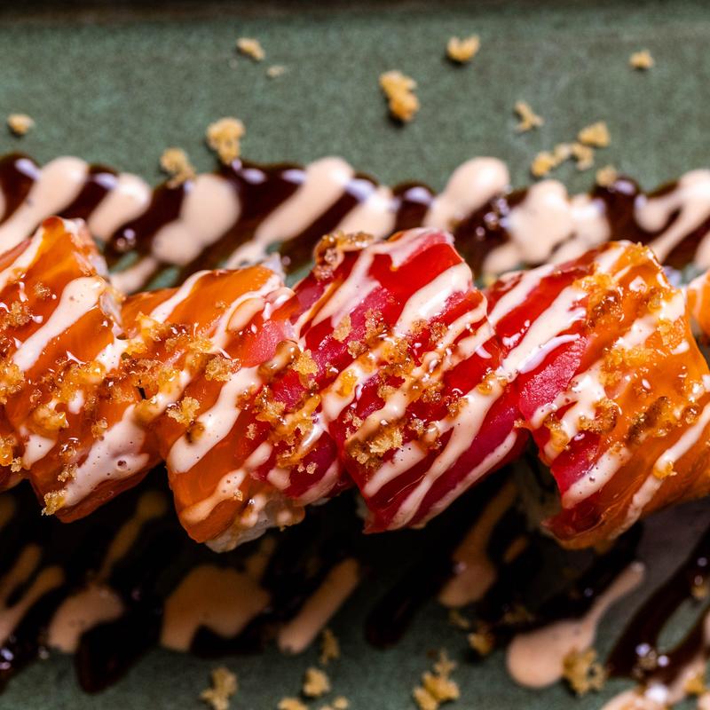 Fresh tuna and salmon come together in a luxurious roll, topped with unagi, avocado, and a luscious layer of eel sauce.