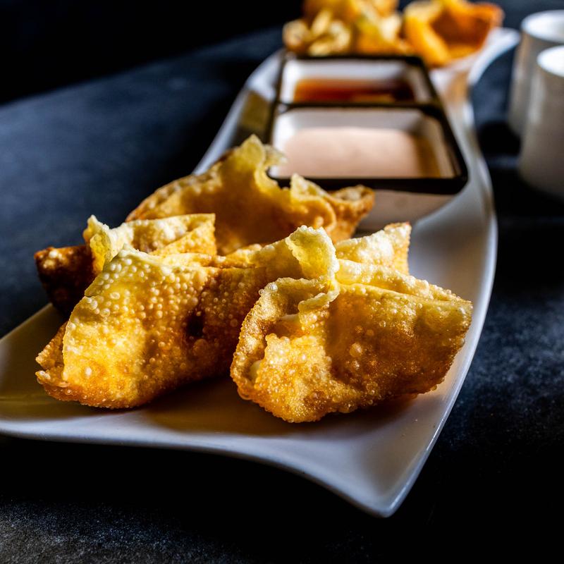 Crispy wontons stuffed with crab and cream cheese, paired with sweet and sour dipping sauce