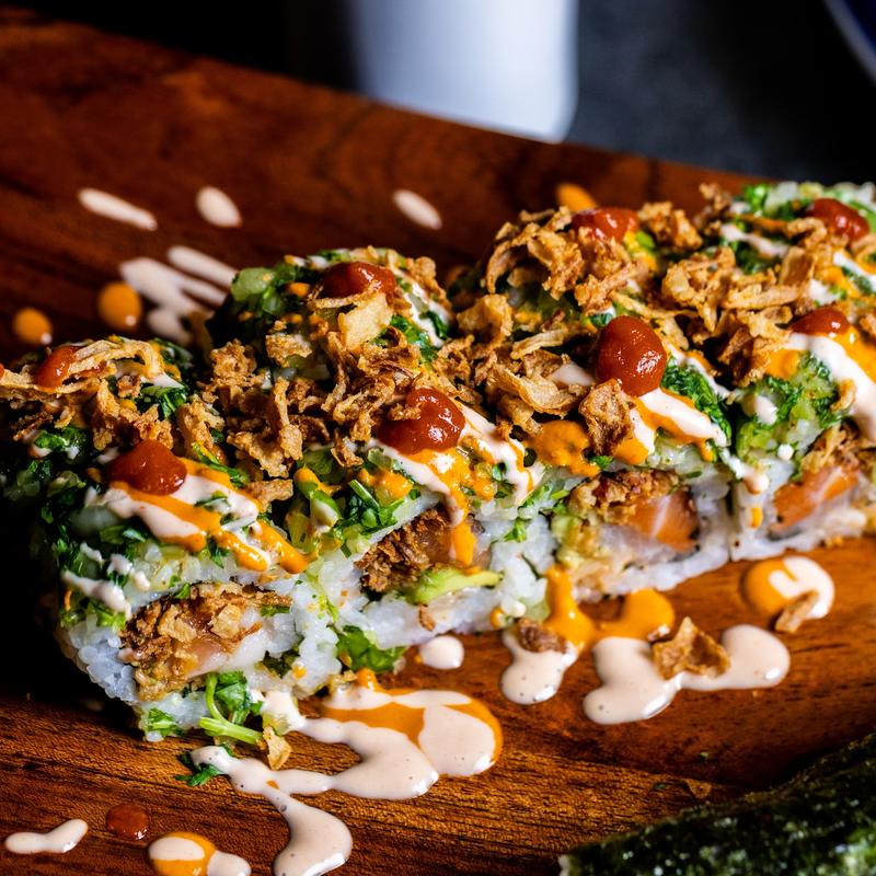 Spicy yellowtail paired with crispy tempura onion, creamy avocado, and fresh cilantro, topped with fresh salmon, jalapeños, and finished with chili oil, spicy mayo, and sriracha.