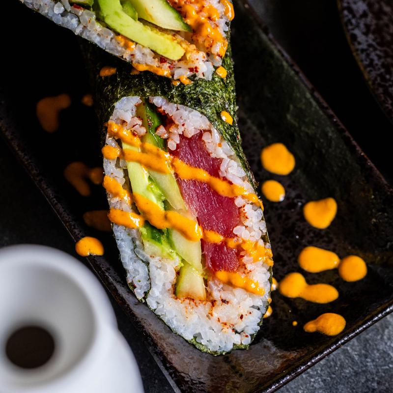 Golden tempura sweet potato, velvety cream cheese, and creamy avocado come together in a delicate soy paper roll, crowned with a light drizzle of spicy mayo.
